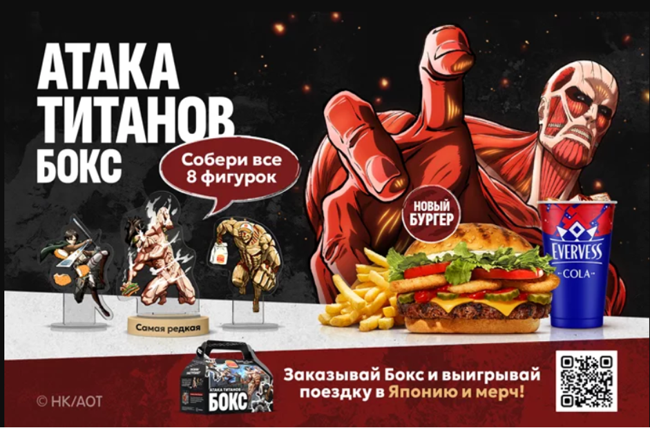 Этой осенью в меню «Бургер Кинга» появились коллекционные боксы с фигурками ключевых персонажей культового аниме «Атака Титанов»: Эрена, Лев, Микасы и других, а также бокалы с героями. Ограниченный тираж, невозможность выбрать фигурку заранее, стаканы, которые все мечтали получить, розыгрыш поездки в Японию и страсть фанатов превратили обычный обед с бургером в охоту за новым экспонатом в коллекцию.