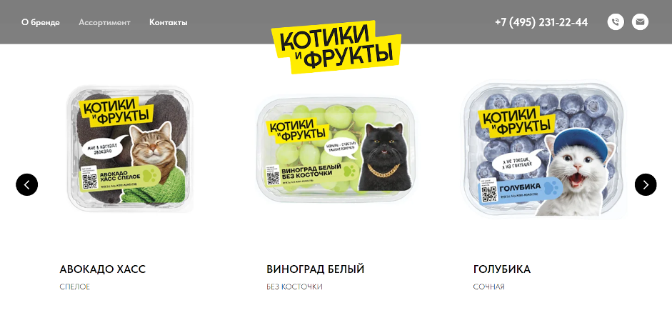 Этой осенью стартовал новый бренд «Котики и фрукты». Смешные котики появились не только в рекламной кампании, но и на самих упаковках с фруктами и ягодами: виноградом, голубикой, ежевикой, киви и малиной. А осень – время, когда нам особенно нужны витамины. «Котики в тренде и всегда привлекают внимание. И еще они счастливы от повседневных вещей: игр, еды, общения, и мы за это их любим. Фрукты — наше призвание. Мы знаем, где искать самые лучшие, как они должны дозревать, у нас есть оборудование, которое проверяет фрукты на спелость, сладость и дефекты. Мы объединили две любви в бренд — так появилась идея “Котиков и фруктов”», — говорит Людмила Овечкина.
