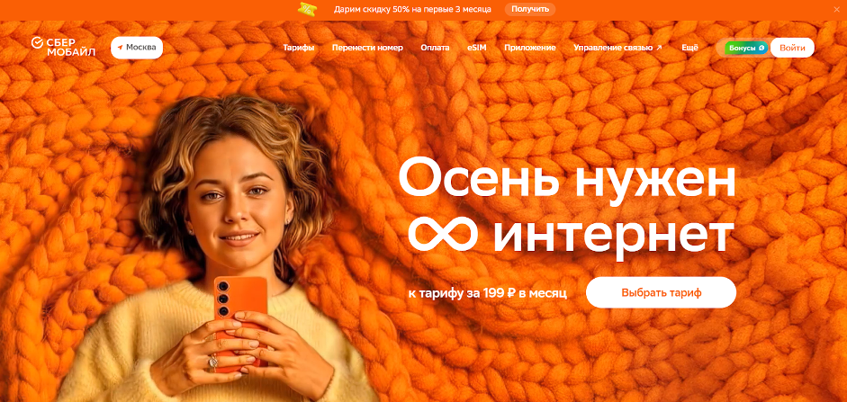 Осенью сайт «СберМобайла» стал очень уютным: главная страница напоминает теплое оранжевое одеяло. Креатив также появился на тв и в диджитале, был интегрирован в шоу, была охвачена наружная реклама и транспорт. На большинстве креативов изображена девушка, но есть несколько наружных щитов с симпатичным котом. «Мы придумывали осеннюю кампанию “Осень нужен ∞ мобильный интернет” из очень жизненного инсайта: поздней осенью, особенно в ноябре, людям совсем не хочется выбираться из-под теплого одеяла в холод и слякоть. Поэтому в коммуникации мы делаем акцент на возможности подключить опцию неограниченного интернета в дополнение к тарифу и подключении опции и тарифов не выходя из дома. В креативе мы сознательно сделали контраст между сыростью и холодом на улице и уютным домом героини», — поделилась Валерия Зубова.