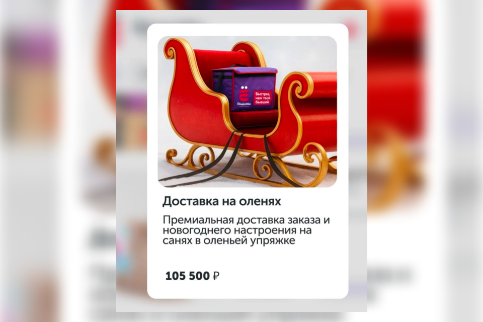 Сервис доставки суши и роллов «ебидоеби» перед Новым годом обещал привезти угощения креативно: в оленьей упряжке. Стоит, правда, услуга 105 500 рублей, да и доступна не во всех городах.